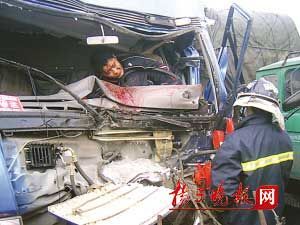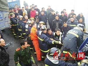 情況緊急,交警迅速調(diào)來清障車,將前面一輛卡車吊離;在騰出足夠的空間后,消防隊(duì)員馬上用機(jī)動(dòng)鏈鋸,在變形的車頭上鋸開一道口子,再用擴(kuò)張器進(jìn)行擴(kuò)張。但由于車頭變形嚴(yán)重,擴(kuò)張器“使不上勁”,破拆進(jìn)行得異常緩慢,而此時(shí)受困司機(jī)的呻吟越來越微弱!安蝗缦瞪侠K子將鋼板拉翻”,現(xiàn)場(chǎng)一位群眾建議。消防隊(duì)員忙找來纜繩,纜繩的一頭拴在卡住司機(jī)身體的鋼板上,另一頭剛垂了下來,很多現(xiàn)場(chǎng)的群眾就趕忙走上前來和十多名消防隊(duì)員一起抓住了繩子,一齊使勁后鋼板卻沒有絲毫松動(dòng)。力量不夠!見此情景,旁觀的其他群眾馬上也加入到了拉繩子的行列中來,很多群眾都光著手死死地拽著鋼繩,“一、二、三”,壓在司機(jī)身上的鋼板終于被掀翻,司機(jī)得救了,現(xiàn)場(chǎng)一片歡呼聲。但躺在駕駛位后面的另一位男子已不治身亡。受傷司機(jī)介紹,事發(fā)時(shí),當(dāng)?shù)赝蝗怀霈F(xiàn)了濃霧,視線受阻,前方卡車突然剎車后,他就一頭撞了上去。 (水梅 路遙 宏偉 王國(guó)柱)