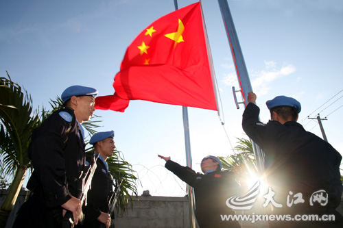 在維和期間,張偉保除了擔(dān)任防暴隊(duì)一分隊(duì)指導(dǎo)員,而且還是國(guó)旗手。今年2月1日,防暴隊(duì)去北京學(xué)習(xí)時(shí),觀摩了國(guó)旗護(hù)衛(wèi)隊(duì)升國(guó)旗的全過(guò)程,之后有幸將2月1日在天安門(mén)升起的國(guó)旗帶到海地。在防暴隊(duì)擔(dān)任國(guó)旗手的張偉保,在每個(gè)月的第一天以及國(guó)內(nèi)的重要節(jié)日里,他都要和兩名護(hù)旗兵一起,將中國(guó)國(guó)旗升起在海地的藍(lán)天下!暗谝淮螌(guó)旗在海地升起時(shí),心里有種說(shuō)不出的激動(dòng)!睆垈ケUf(shuō)。