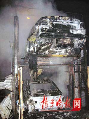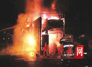 昨天(4日)凌晨時分,記者接到市民李先生報(bào)料后迅速驅(qū)車趕往現(xiàn)場,過了機(jī)場高速翠屏山匝道口時,已經(jīng)能聞到空氣中有一股濃濃的焦味。又開了兩公里后,道路開始擁堵起來,不久車輛便完全停滯下來,無奈之下記者只得棄車徒步趕往現(xiàn)場。直至兩公里開外,終于看到了失火的運(yùn)輸車,只見運(yùn)輸車車廂已經(jīng)被濃煙籠罩,車廂里不停傳出“噼里啪啦”的爆響,從車廂縫隙處可見紅光閃閃。不一會兒,“砰砰”兩聲巨響傳出,車輪燒爆后炸破了車廂擋板。記者這才發(fā)現(xiàn)8輛寶馬轎車正在火籠中“煉獄”,輪胎、塑料部件已經(jīng)在燃燒,無人敢靠近。交警為防止車輛爆燃,危及過往車輛,封閉了所有往機(jī)場方向的入口,并對現(xiàn)場車輛和人員及時疏散。該運(yùn)輸車兩側(cè)油箱裝滿了柴油,火勢如無法得到有效控制,繼續(xù)下去,分為兩層擺放的轎車一旦轟然坍塌,恐怕會造成油箱爆炸。不久,又有兩輛大型消防車趕到現(xiàn)場增援。消防員冒險撬開車廂擋板,用5條水龍對火舌猛烈噴水。直至凌晨1點(diǎn)左右,火勢才被完全控制,但總價值400多萬的4輛寶馬5系和4輛寶馬3系轎車幾乎成了一堆廢鐵。