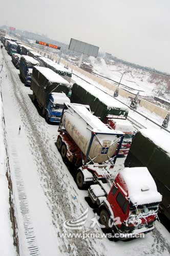 1月13日,九江下起了近10年來最大的一場雪。這場大雪造成九江長江大橋交通堵塞。因為橋面結(jié)冰打滑還引發(fā)幾起小的交通事故。為了安全起見,九江交警部門立即實施“封橋”,逾萬輛車停滯在九江市境內(nèi)。武警九江支隊出動百名官兵,緊急疏通被阻交通。