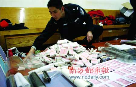 隨后,偵查員將小轎車車主吳某押至其租住的浪尾村出租屋。民警沖進房間,將正在房間內(nèi)整理假票的吳某妻子抓獲,當(dāng)場繳獲成品假火車票3張和半成品假火車票3萬張,以及制造假火車票的專業(yè)印刷排版工具一批。偵查員在抓獲主要犯罪嫌疑人的同時,另一路專案組偵查員也同時直撲藥店,一舉將正在該藥店進行假票銷售交易的嫌疑人尹某和廖某當(dāng)場抓獲,在該藥店火車票代售點,警方搜出了大量用于訂票所用的單據(jù)和憑證。
