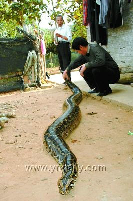 有時候夜間天冷時,蟒蛇還會爬出房間,將楊建松臥室的門弄開,爬上床來與楊建松同床共枕,碰到楊建松睡覺翻身壓到身上時,這條蟒蛇還會“自覺”地挪挪身子給他騰地方。這樣的狀況一直持續(xù)到楊建松結(jié)婚,將其安置在后院特制的鐵柜中才告結(jié)束。