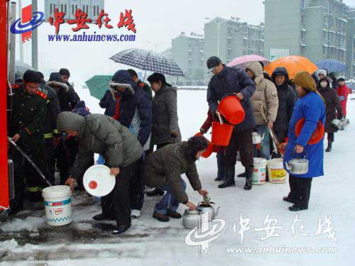 受暖濕氣流和冷空氣的共同影響,25日以來,安徽省銅陵市再次出現(xiàn)連續(xù)性強(qiáng)降雪,氣溫也繼續(xù)下降,最低達(dá)零下4℃,全市出現(xiàn)了長(zhǎng)時(shí)間的凝凍天氣。從26日上午開始,市內(nèi)多條供水主管道相繼被凍結(jié)或爆裂,上萬居民陷入了無水可用的困境。銅陵市消防支隊(duì)及時(shí)啟動(dòng)了雨雪災(zāi)害搶險(xiǎn)救援應(yīng)急預(yù)案,先后出動(dòng)4輛消防車、20余名官兵,冒著大雪和嚴(yán)寒,往返于取水點(diǎn)與居民區(qū)之間,為居民們送來了12車、共70噸清水,解決了居民們的燃眉之急。