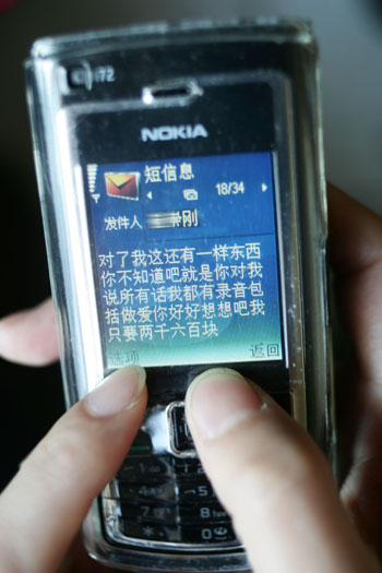 1月28日,麗娜的手機突然收到了一條短信:“我這有一樣你的東西,你不知道吧?就是你對我說的所有話我都有錄音和視頻,包括咱們在一起××,你好好想想吧!我只要2600塊錢!丙惸瓤吹竭@則短信后非常害怕,就打電話給王剛,希望他不要有過激行為,但王剛說如果不給錢,就讓全世界都知道麗娜的“丑事”。