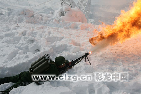 云南昭通武警用火焰噴射器為電力設施除冰(圖)
