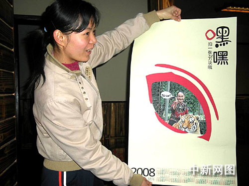 記者看到,網(wǎng)友“小二黑”的“周老虎年畫”作品非常簡潔、有趣,頗具幽默和滿諷刺。年畫左上角寫著“黑嘿,拍一張2萬元”,中間是身材瘦小、眉開眼笑的周正龍騎在一只老虎背上,揮手致意,下面是2008年的日歷。