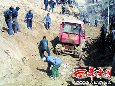 ”昨日中午12時,在場指揮的子洲縣委書記雒鳳翔介紹說。救援現(xiàn)場一輛推土機(jī)正在推走從30米高崖上墜落的土方,七八名鄉(xiāng)親用大鋤頭正在挖土搜救被埋人員,120急救人員、縣醫(yī)院醫(yī)生在此等候救治傷員。
