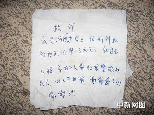 這天下午,一位熱心的中年婦女把發(fā)現(xiàn)字條的情況告訴了正在此地巡邏的民警,并把民警帶到樓下。民警見字條上面寫著“救命,我是湖南一女學(xué)生,被騙到此被他們囚禁了兩天了,就在六樓,希望好心人幫忙報(bào)警救我出去,好人有好報(bào)、謝謝您了!!”。