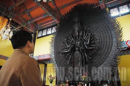 龍泉石經(jīng)寺內(nèi)雕成的東南亞最大烏木千手觀(guān)音,所用烏木據(jù)測(cè)已有7000年歷史。昨(11)日,這尊千手觀(guān)音首次亮相,展露祥容。本月22日,石經(jīng)寺將舉行盛大開(kāi)光儀式,(四川)省內(nèi)外高僧大德云集,并進(jìn)行學(xué)術(shù)研討,烏木千手觀(guān)音將正式向游人開(kāi)放。
