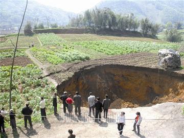 2008年3月25日凌晨,宜賓江安縣紅橋鎮(zhèn)五閣村發(fā)生了局部地面塌陷,形成大小不等的3個(gè)巨型“天坑”,呈直線展開,長(zhǎng)約400米。塌陷嚴(yán)重威脅到附近的11家住戶57人。險(xiǎn)情發(fā)生后,江安縣委、縣政府及當(dāng)?shù)丶t橋鎮(zhèn)政府立即緊急疏散塌陷影響區(qū)域內(nèi)的居民,并對(duì)“天坑”實(shí)施24小時(shí)的臨時(shí)警戒,防止意外事故發(fā)生。截至昨日,國(guó)土資源部門的地質(zhì)專家現(xiàn)場(chǎng)查勘得出的初步結(jié)論是:該地面塌陷是因?yàn)榈叵氯芏匆l(fā)的小型巖溶塌陷,是自然形成的地質(zhì)災(zāi)害;進(jìn)一步的結(jié)論及處置措施待觀察3—5天后再定。