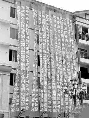 昨天,在不少門戶網(wǎng)站的論壇上出現(xiàn)了一篇名為《洗腳城開張的驚人場面 為何這么多公檢法機關捧場》的帖子。帖子一開始就提出了一個質(zhì)疑:一個洗腳城開張為何有這么多公檢法機關捧場?網(wǎng)友拍攝的圖片顯示:在張家界武陵源區(qū),一棟建筑物外懸掛著二十多個紅底白字的條幅,分別為“××熱烈祝賀金體康濯足休閑會所開業(yè)大吉”、“××熱烈祝賀金體康濯足休閑會所生意興隆”。最讓人驚訝的是,這些祝賀單位,不少竟然是當?shù)氐恼畽C關,包括人民法院、人民檢察院、稅務局、房管局等,涉及到的政府部門多達10余個。