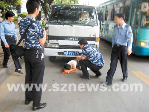 前天下午5時,南頭街道綜合執(zhí)法隊在南頭古城東門口例行巡查時,發(fā)現(xiàn)多個小攤販占道經(jīng)營。見到執(zhí)法人員從車內(nèi)走出來,不少小攤販自覺收起小推車走人。但是,一名賣菠蘿的女攤販見到執(zhí)法人員后,仍然我行我素。執(zhí)法人員只好將其小三輪車暫扣下來。但女攤販一下子鉆入執(zhí)法車下面不肯出來。一名執(zhí)法人員去拉她出來的時候,被她抓傷。女攤販還聲稱,“你們不讓我擺攤,我就不讓你們好過!”。