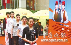 本報(bào)訊 昨日上午,沙坪壩區(qū)三峽廣場數(shù)碼城外,南航“2008中國新空姐招募大匯”開幕。這是繼2006年在全國以海選模式招聘空姐以來,南航第二次采用同樣方式在重慶招募空姐。據(jù)現(xiàn)場組委會統(tǒng)計(jì),昨天,通過網(wǎng)上和現(xiàn)場報(bào)名的女孩有2000來人,現(xiàn)場有1000多人進(jìn)行了常規(guī)檢驗(yàn),最終留下300人。