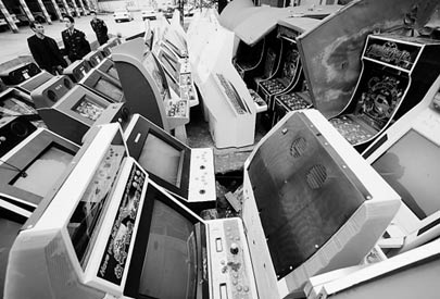 100多平方米的電玩城分為兩個(gè)房間,外面的是正規(guī)游戲機(jī),里間則密密麻麻地?cái)[著賭博機(jī)。里間門有人專門把守,一有風(fēng)吹草動(dòng),望風(fēng)的人就會(huì)給在里面賭博的人打手機(jī)通風(fēng)報(bào)信,里間人馬上可從專門開的邊門逃走。