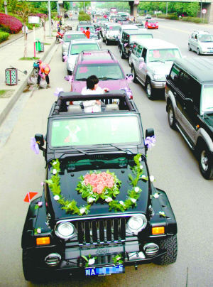 三菱帕杰羅、陸地巡洋艦、大切諾基、豐田普拉多、本田CRV、牧馬人……昨日上午,52輛各種品牌的越野車,組建成綿延1公里長的婚車隊(duì)伍,從西門穿城到東門迎娶美麗的新娘子,又浩浩蕩蕩地朝東湖公園婚禮現(xiàn)場進(jìn)發(fā),好不拉風(fēng)!新娘子說:“戀愛8年啦,就想要這么一場轟轟烈烈的婚禮!”