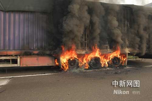 當(dāng)天早晨6時(shí)許,一輛車牌為冀AF3978(掛車牌照為冀AZ747)的大貨車在京珠高速臨長(zhǎng)路段由北往南50公里處行駛時(shí),車輛右后胎因?yàn)槟Σ镣蝗黄鸹。隨后,車上裝載的雞蛋的紙盒也很快燃燒起來,駕駛?cè)笋R上報(bào)警。
