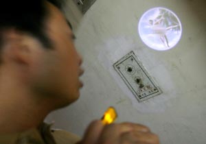 和普通的一次性打火機(jī)不同的地方,就在于在艷照打火機(jī)的機(jī)身上附帶有一個(gè)可以在墻壁上投影成像的“小電筒”。在打火機(jī)機(jī)身的側(cè)面,有一個(gè)開(kāi)關(guān),只要將開(kāi)關(guān)打開(kāi),位于打火機(jī)底部的“小電筒”就會(huì)通電發(fā)光,并將一些露骨的艷照?qǐng)D象投射在墻壁上。據(jù)測(cè)試,在距離燈源0.1米-1.5米的墻壁或者其他物體上都可以形成比較清晰的圖像,在0.1-1.5米之間,距離越遠(yuǎn),所投射出來(lái)的圖象越大。拆開(kāi)打火機(jī),可以看到在小燈泡前安裝有一個(gè)長(zhǎng)度約2厘米的塑料圓錐管。在端口較大的一端有一塊直徑約1厘米左右的小鏡片,有放大鏡的效果,在端口較小的另一端,也有一個(gè)小鏡片,上面就印有投影出來(lái)的艷照?qǐng)D片。(記者張波 黃凱)