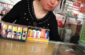 “老板,打火機(jī)多少錢一個(gè)?”記者試探著向店里的一位中年婦女詢問(wèn)價(jià)格!皢钨u2元一個(gè),如果你要的多,可以便宜點(diǎn)給你!敝心陭D女稱如果一次購(gòu)買50個(gè)打火機(jī),單個(gè)以1.5元出售。記者以批發(fā)大量打火機(jī)為由,想讓店鋪老板說(shuō)出直接聯(lián)系打火機(jī)制造廠商的方法,但中年婦女擔(dān)心生意被搶,堅(jiān)決不肯透露任何信息!澳銈円I可以先付訂金給我,我打電話給賣火機(jī)的人預(yù)定,你們要多少都可以!钡曛髡f(shuō)艷照打火機(jī)也是最近才進(jìn)的貨,還比較好銷,生意好的時(shí)候一個(gè)月能賣出50個(gè)左右?从浾吣弥饳C(jī)觀察了一陣并沒(méi)有購(gòu)買的意思,店主開(kāi)始有些警覺(jué)起來(lái),打算將裝有艷照打火機(jī)的盒子收起來(lái)!叭绻肱l(fā)可以來(lái)找我!