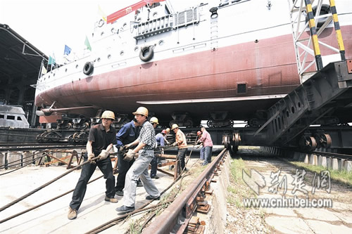 上午9時(shí),位于白沙洲的武漢南華高速船舶工程股份有限公司內(nèi),21臺(tái)移船小車在絞索的牽引下,沿鋼軌緩緩將中山艦送到移船大車上。約10:10,移船大車在四臺(tái)牽引機(jī)車牽引下,載著中山艦沿著南華公司的滑道,向江邊駛?cè)ァ?/p>