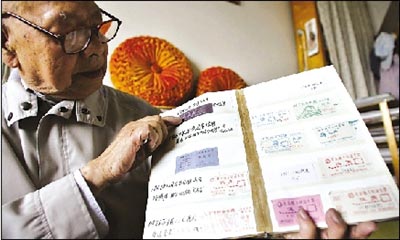 吳世茂老人展示他收藏的紙質(zhì)地鐵車票。記者 周民 攝