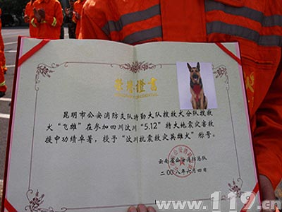 2008年6月6日下午,云南消防總隊在昆明消防訓練基地隆重舉行儀式,授予赴川抗震救災(zāi)的“銀虎”、“昆虎”、“小虎”、“金雕”、“菲離”、“威嚴”、“飛雄”7條搜救犬“汶川抗震救災(zāi)英雄犬”稱號。云南消防總隊總隊長王子崗,副總隊長代如田、洪利川,昆明消防支隊支隊長楊文華、政委盧桂平及支隊在家黨委成員出席授勛儀式。儀式由省消防總隊副總隊長洪利川主持。