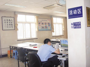 記者看到張文的房間里住著8名被治安拘留的人員,其中有4人都是醉酒被拘留的司機。醉酒被拘人員每天早晨6時30分起床洗漱,然后開始打掃宿舍衛(wèi)生,7時10分開始吃早餐,兩個饅頭,稀飯就咸菜。上午除了參加交通法規(guī)集中學(xué)習(xí)和聽廣播外,其余時間都是打掃衛(wèi)生或者幫著民警干一些雜活。上午11時開始吃午飯,內(nèi)容還是饅頭稀飯咸菜。中午12時至14時是午休時間。