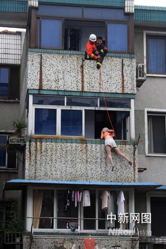 這可不是哪部武俠小說里的場景,也不是在拍攝動作片,而是6月24日中午11時浙江省越城區(qū)消防大隊官兵救下一名輕生女子的真實寫照。