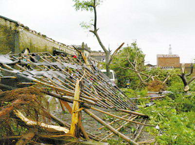 “好嚇人!忽然一陣陣巨響傳來,我馬上呼喚村民快跑!闭f起事情經(jīng)過,村民甄先生驚魂未定。他告訴記者,昨天上午9時51分,他正在錦屏禮堂里維修,只聽“呼”的一聲巨響,緊跟著狂風(fēng)就吹進(jìn)來,他趕緊去關(guān)門,手一下子就被門夾住了。當(dāng)他跑出大門后看到,村民的房子頂部所有的磚瓦已經(jīng)被掀掉,碎片不斷地跌落地上,強(qiáng)勁的龍卷風(fēng)把他也吹得倒退幾步后跌倒在地。只見木頭四處亂飛,噼里啪啦地在響。一股強(qiáng)風(fēng)一直在房屋附近盤旋,大塊的鐵皮夾著磚頭、瓦塊等在空中飛舞,旋轉(zhuǎn)了幾圈后,“砰”的一聲落了下來。強(qiáng)勁的龍卷風(fēng)大約持續(xù)了3分鐘,所到之處只聽到“呼呼”的勁風(fēng)響。