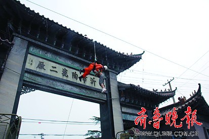 就在此時(shí),消防員飛身撲了上去,將該女子抱住。由于這名女子拼命掙扎,二人雙雙從門樓上掉了下來,幸虧消防員身上的繩子才使兩人懸在半空中。