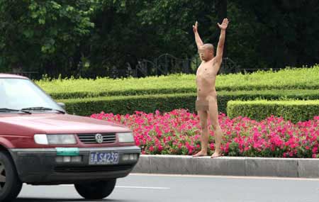 “瘋了!我瘋了!”7月2日15時(shí)40分,一男子在長(zhǎng)春市人民廣場(chǎng)上擺起了“裸男”的造型,嘴里還不停地嘀咕自己瘋了,引來了眾多圍觀者,造成該路段的交通一時(shí)堵塞。