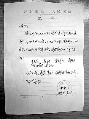 與周丹一起被停職的還有她的兩名同事。在開封市第二人民醫(yī)院對(duì)這三人的停職通知上,寫明是“按市衛(wèi)生局下發(fā)‘關(guān)于加大公職人員拆遷力度的通知’”。開封市衛(wèi)生局5月30日下發(fā)的這個(gè)通知要求,從自6月2日起,各單位涉及拆遷的公職人員一律停薪停職,全部脫產(chǎn)回家做工作。