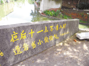 記者隨即撥通了元昌村民小組所屬的順德區(qū)杏壇鎮(zhèn)路涌村委會書記周肖杰的電話,他委托一位不愿意透露姓名的村干部接受了記者的采訪,稱標(biāo)語是近日貼出的,”是我們小組20多戶人家開會集體制定的這條村規(guī)民約,我們也是實在沒有辦法,因為村里面經(jīng)常發(fā)生被盜事件,村民損失很大,所以成立了防偷小組,貼出這樣的標(biāo)語,也是為了晚上巡邏時方便些。也希望阻嚇那些犯罪分子,不要隨便進(jìn)我們村!