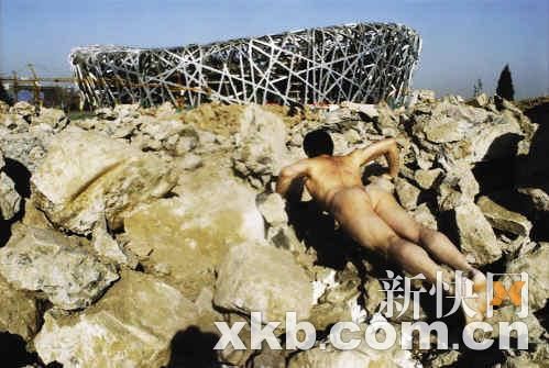 區(qū)志航用裸體俯臥撐與鳥巢"對(duì)話"。