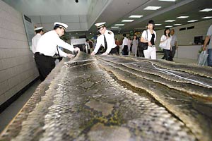 16張數(shù)米長(zhǎng)的蟒蛇皮,展開(kāi)鋪在海關(guān)查驗(yàn)臺(tái)上。日前旅客賴某想走私這些國(guó)家一級(jí)保護(hù)野生動(dòng)物蟒蛇皮進(jìn)境牟利,在拱北口岸就被查獲。這些蟒蛇皮每張長(zhǎng)度在3~5米左右。這是拱北口岸首次查獲旅客攜帶蟒蛇皮進(jìn)境走私案。(記者陳治家 通訊員黃慧賢、張建林?jǐn)z)