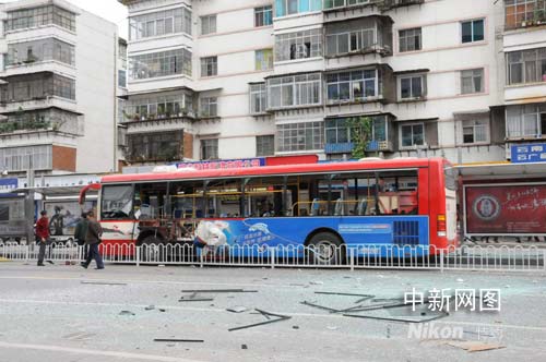 昆明市警方稱,二十一日七時(shí)許,一輛開往岷山的五十四路公交車由東向西行駛至潘家灣人民西路與西昌路交叉口公交車站臺(tái)停車時(shí)突然發(fā)生爆炸,致一人死亡,一人重傷,九人輕傷;車廂兩側(cè)玻璃全部破碎,部分座椅變形。同日上午八時(shí)許,另一輛五十四路公交車由東向西行駛至人民西路與昌源中路交叉口時(shí)發(fā)生爆炸,導(dǎo)致一人現(xiàn)場(chǎng)死亡,四人受傷。