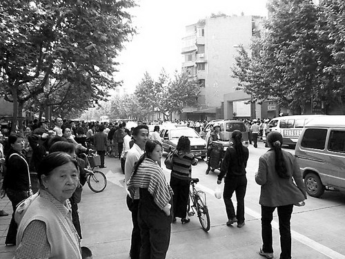 百姓圍觀,警方在醫(yī)院周?chē)鹁渚。杜先福攝