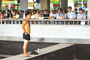 昨天下午3點10分左右,一年輕男子赤裸著上身,下身也僅穿了條黑色短褲,光腳爬上火車站站內(nèi)廣場,地鐵通道上的一根橫梁柱上,其腳下就是近10米高的地下通道,據(jù)圍觀市民介紹,該男子手叉腰部兩側(cè),既不說話,也不挪動半步。旅客見狀紛紛向該男子叫喊,希望他想開一些,可該男子似乎“無動于衷”。