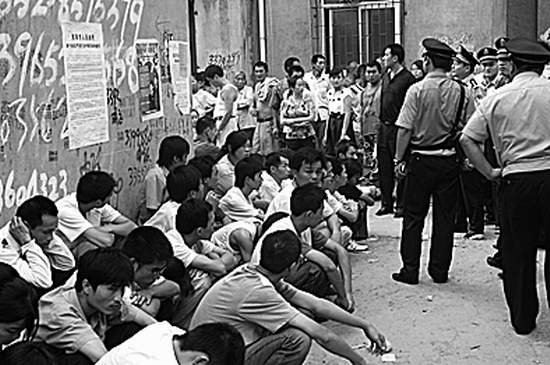 記者隨同民警清查時(shí)發(fā)現(xiàn),樓房?jī)?nèi)幾乎每個(gè)房間都是房門緊鎖,任由外面的民警怎么敲門,里面的人就是不開(kāi)門。在二樓的一個(gè)房間外,民警敲門足足幾分鐘始終無(wú)人開(kāi)門,于是將門鎖撬開(kāi)進(jìn)入,發(fā)現(xiàn)簡(jiǎn)陋的客廳里,靠四周墻壁坐著20多個(gè)年輕人,男的占大多數(shù)。