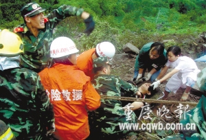 由于連日暴雨,昨天凌晨6時許,省道103渝巴路云陽段突發(fā)大面積山體滑坡,泥石將途經(jīng)此地的一輛“雪佛蘭”轎車掩埋。接到報警后,云陽和萬州的消防緊急趕到現(xiàn)場,經(jīng)5小時努力,成功救出3名受傷男子。目前,3人脫離生命危險。