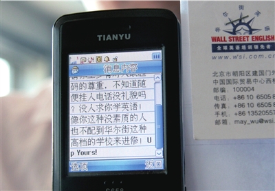 昨天,市民劉先生反映,他因掛斷華爾街英語國貿(mào)中心課程顧問的電話,對方于8月9日中午給他發(fā)來辱罵短信,有罵其沒有素質(zhì)、不配到高檔學(xué)校進(jìn)修等內(nèi)容。經(jīng)交涉,華爾街英語方面向其致歉,并對員工作出警告處理。