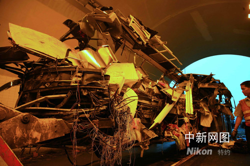 記者趕到現(xiàn)場時,受傷人員已被救出送往醫(yī)院搶救。高速交警、路政等有關(guān)人員正在現(xiàn)場處理,施救人員正在清理路面。一輛臥鋪大客車停在隧道入口的地方,車頭已面目全非,靠駕駛員一側(cè)車身大半像被刀劈開一樣。入隧道口之前的中間護(hù)欄也已被毀,地上滿是客車上掉下外殼、玻璃等殘骸和旅客行李。