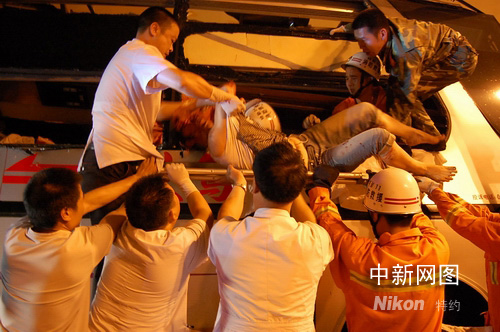 在救援過程中,消防官兵還不停安慰傷者,救援人員經(jīng)過將近3個(gè)小時(shí)的艱苦破拆工作,終于將擠壓傷員車體部件一一拆下,將乘客救出。