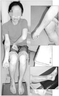 3名女工說:由于長時間戴手套、穿膠鞋工作,手腳不透氣,6名女工均不同程度地染上了腳氣、灰指甲等疾病。而洗衣時要接觸被化學(xué)物品污染的工作服以及洗衣藥品,她們的皮膚也都受到不同程度的灼傷。