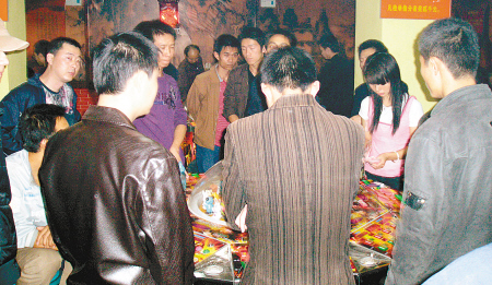 當晚8時許,記者為此趕到位于高新區(qū)光華路徐家莊村北口的“電玩世界”進行暗訪,走進這家電玩娛樂廳,記者發(fā)現(xiàn)不時出入的男男女女,除了少部分人在擺設(shè)的幾臺電玩游戲機前進行娛樂外,大多數(shù)人徑直走進通入店內(nèi)的一扇小門。記者走進那扇小門時,發(fā)現(xiàn)這個百余平方米的“套間”內(nèi)生意異;鸨6臺大型“動物樂園”游戲賭博機前,圍聚了上百名男女,有觀戰(zhàn)的,有不時“豪爽”掏出50元、100元鈔票投幣、押注的。其中一名手捏一厚沓鈔票的青年男子,連連拿出鈔票投押,約一個小時后,該名男子手里的鈔票一輸而光后起身離開,記者追上佯稱切磋玩技與其攀談時,該男子卻不以為然地說“賭場如戰(zhàn)場,自然有輸有贏”,并稱自己玩賭機現(xiàn)已上癮,一小時輸?shù)羧f余元也很正常。至于“動物樂園”的賭博規(guī)則,當然要手里有錢,幾個人可以連機互賭,或單人押分賭注。