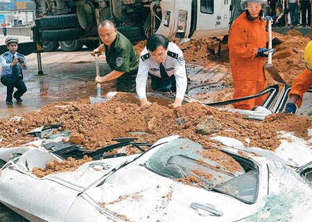 據(jù)記者回憶,10月10日上午10時(shí)50分左右,在深圳市北環(huán)大道西行方向南山立交路段,一輛泥頭車突然失控翻車,將旁邊一輛白色轎車壓扁。事發(fā)后,市交警局局長(zhǎng)劉鳳俊及時(shí)趕到現(xiàn)場(chǎng)組織指揮救援。救援人員調(diào)來(lái)兩輛大型吊車,吊住泥頭車首尾兩處,試圖將泥頭車吊起。但剛啟動(dòng)吊車,救援人員就發(fā)現(xiàn)泥頭車裝載的泥土太重,很可能會(huì)掉落下來(lái)將轎車埋住。經(jīng)現(xiàn)場(chǎng)研究,救援人員決定先挖出部分泥土后,再吊起泥頭車,F(xiàn)場(chǎng)十幾名救援人員迅速拿來(lái)鐵鏟與鋤頭,開始挖土。劉鳳俊沖到泥頭車前,因沒工具了,他就用手不停地挖泥土,并大叫:“加油挖啊!”在劉鳳俊的帶領(lǐng)下,現(xiàn)場(chǎng)的幾十名救援人員一起用手刨土救人,最終從車內(nèi)救出一名女嬰。