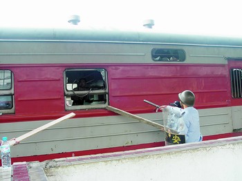 昨日清晨6時57分,由廣州開往長沙的5362次列車到達長沙車站,?吭谌九_五道。長沙車站派出所民警戴戈與列車乘警辦理完交接手續(xù)后,接到該車行李員陽小華報告,稱當日6時許,該次列車到達株洲裝卸完行李準備開車時,突然沖上來一名穿白T恤的中年男子,“撲通”一聲跪倒在他面前,稱有人追殺他。同時,該男子手持深圳至婁底的車票。男子上車后一直躲在行李后,充滿恐懼,經(jīng)行李員多方勸解無果。列車終到長沙車站后,該男子將行李員趕下車廂,將行李車廂的正門反鎖,將通道門用貨物堆碼封閉,并手持一根釘有鐵釘、長1.5米的粗木棒揮舞,不許任何人靠近。