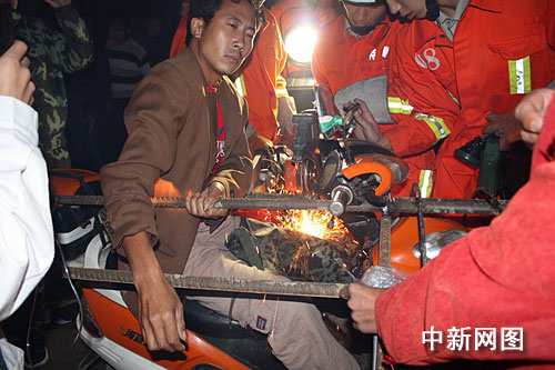 余姚消防大隊接到報警后,調(diào)派兩輛消防車9名消防員趕赴現(xiàn)場。在對現(xiàn)場進行了警戒之后,余姚消防大隊的王中隊長利用機動液壓擴張剪先把插入朱先生體內(nèi)的鋼筋固定后,由另一名消防員用無齒鋸對鋼筋進行切割。為讓切割過程中,朱先生免受高溫傷害,消防員在切割時用水對鋼筋進行降溫,在用完整整一瓶礦泉水后,朱先生終于成功被救出,并送上了救護車。