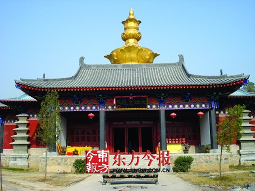 方鼎模樣的山門上方是少林寺方丈釋永信手書的“洞林大覺禪寺”六個(gè)鍍金大字。老人的視線前方,是一座已經(jīng)投入使用的仿印度風(fēng)格的大雄寶殿,大殿前方正在建造的高30多米的兩座鐘鼓樓,已顯氣勢(shì)。2008年11月3日上午,位于滎陽市賈峪鎮(zhèn)洞林村的洞林寺正在緊張施工。