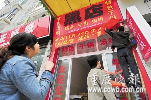 “取這樣的名字就是為了吸引眼球,其他沒啥特別的意義!辈宛^老板楊宗寶稱。今年25歲的楊宗寶是合川區(qū)人,以前打工為生,最近才和好友合伙開此湯鍋店!盀榱巳(gè)特別的名字,我們想了四五天。”楊宗寶稱,他經(jīng)常玩網(wǎng)絡(luò)游戲“魔獸爭霸”,游戲里把特別厲害的戰(zhàn)隊(duì)稱為“黑店”,左思右想后,他決定把“黑店”復(fù)制到自己的餐館身上!斑@不,餐館明天才開業(yè),不過招牌掛出來就吸引了不少人氣!彼靡獾卣f,沒聽有人說啥不好的。