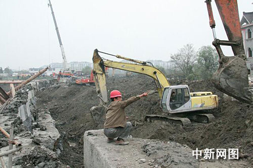 工作人員正在現(xiàn)場(chǎng)指揮挖土機(jī)。